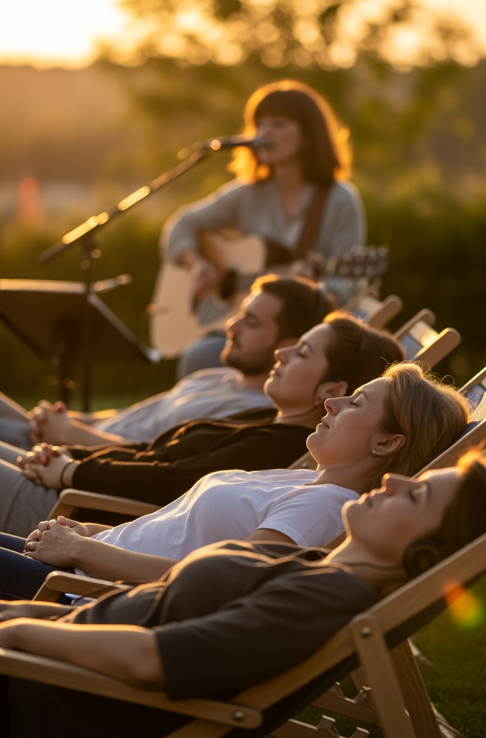 Le public s’installe confortablement — sur des coussins, des transats, parfois même à l’ombre d’un arbre.